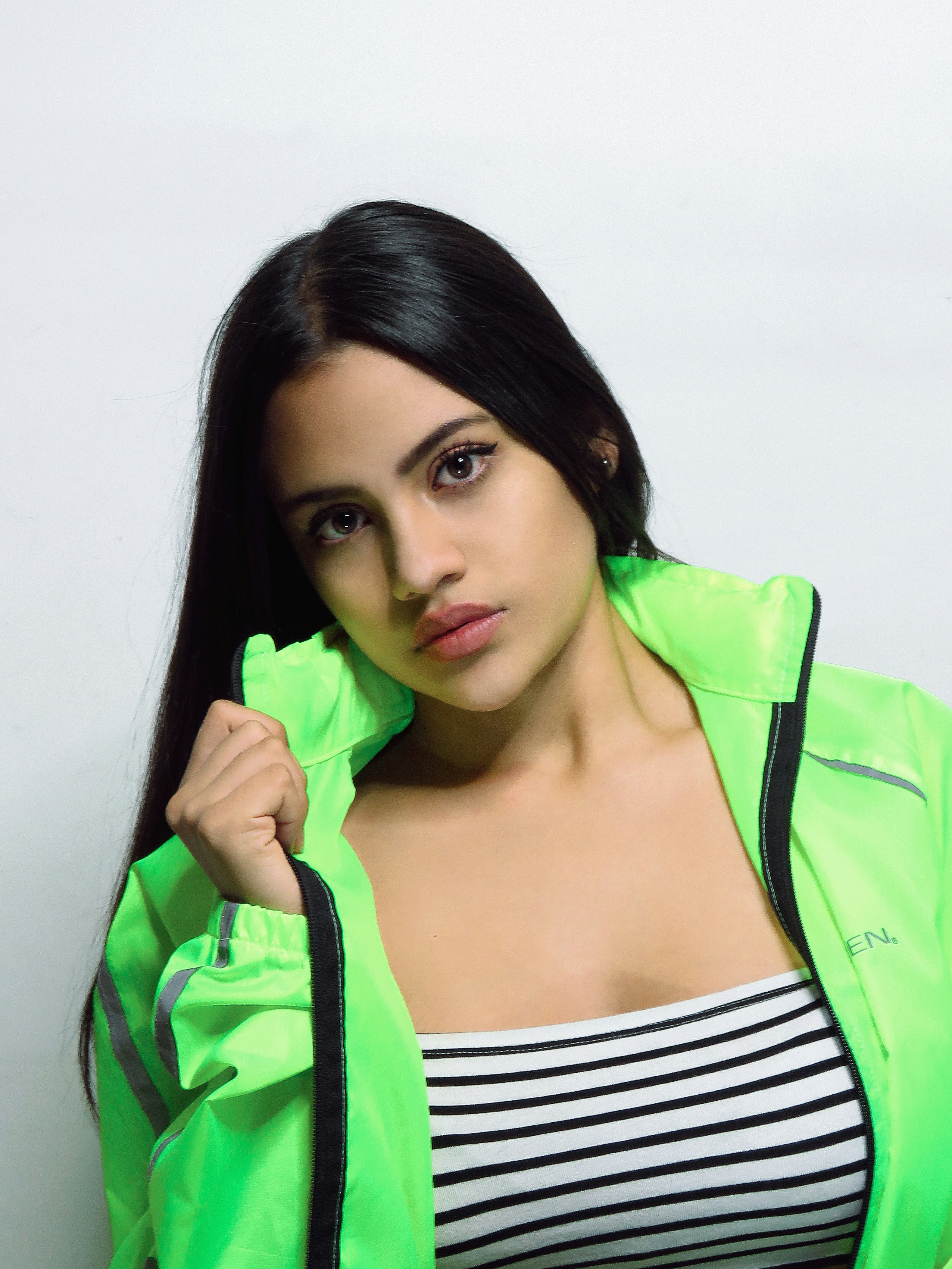Attractive White Skin Woman Wearing A Bright Green Jacket Upper